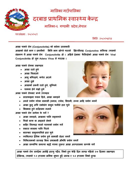 मालिका गाउँपालिका –६ दरबाङ प्राथमिक स्वास्थ्य केन्द्रले आँखा पाक्ने रोगका बारेमा सार्वजनिक गरेको सुचना यस्तो छ :