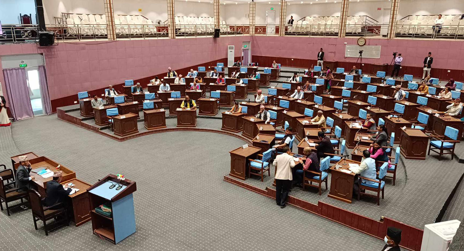 बैठकमा आज शून्य समयमा सांसदहरु बाेलेपछि दोस्रो कार्य सूचीमा सरकारको तर्फबाट मुख्यमन्त्री डिल्लीबहादुर चौधरीले विधेयक पारित गरियोस् भन्ने प्रस्ताव पेस गरेका थिए । त्यसपछि सभामुख तुलाराम घर्ती मगरले विधेयक पारित गरियोस् भन्ने प्रस्तावलाई निर्णयार्थ प्रस्तुत गरेका थिए।