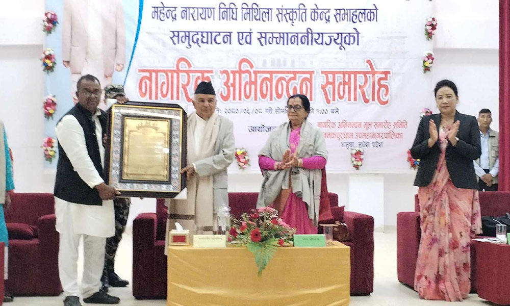 जानकी मन्दिरमा पूजापाठ र महेन्द्र नारायण निधि मिथिला संस्कृति केन्द्रको समुद्घाटन गर्न आएका राष्ट्रपति पौडेललाई जनकपुरधाम उपमहानगरपालिकाको आयोजनामा नागरिक अभिनन्दन गरिएको छ ।