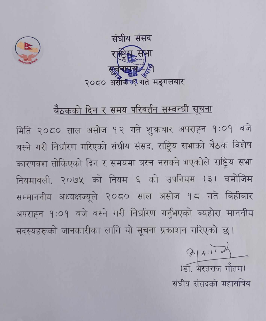 १२ असोजमा बोलाइएको बैठक १८ असोज बिहीबार दिउँसो १ बजेर १ मिनेटमा बस्नेगरी सारिएको संघीय संसदमा महासचिव डा भरतराज गौतमले जानकारी दिए । उनका अनुसार विशेष कारणवश तोकिएको दिन र समयमााम बस्न नसक्ने भएकाले बैठक सारिएको हो ।