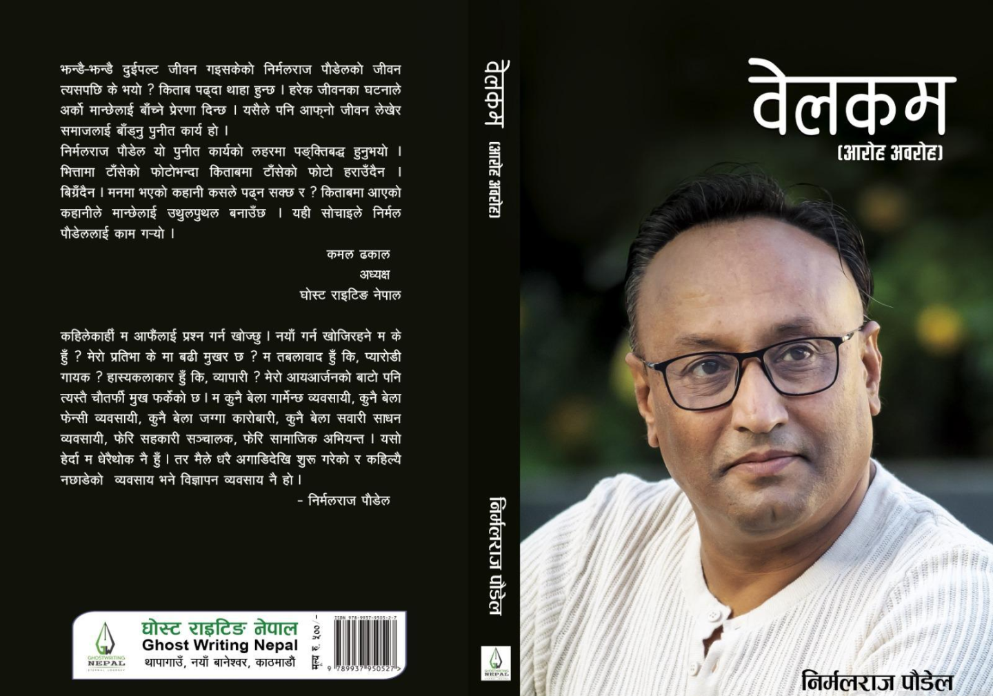 काठमाडौँ । नेपालमा विज्ञापन क्षेत्रका जानकार एवं व्यवसायी निर्मलराज पौडेलको पुस्तक ‘वेलकम आरोह अवरोह’ सार्वजनिक भएको छ । आत्मकथामा आधारित सो पुस्तकमा उनका आफ्ना भोगाइका अतिरिक्त नेपालको सञ्चार क्षेत्रको अवस्था, विज्ञापन निर्माण र यसको बजारलगायतका विषय समेटिएको छ ।