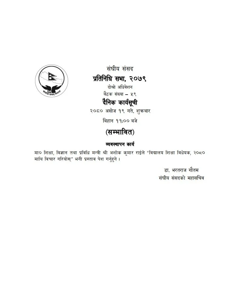 बैठकमा शिक्षा, विज्ञान तथा प्रविधि मन्त्री अशोक कुमार राईले विद्यालय शिक्षा विधेयक, २०८० माथि विचार गरियोस् भनी प्रस्ताव पेस गर्ने कार्यसूची रहेको सङ्घीय संसद्का महासचिव डा भरतराज गौतमले जानकारी दिए ।