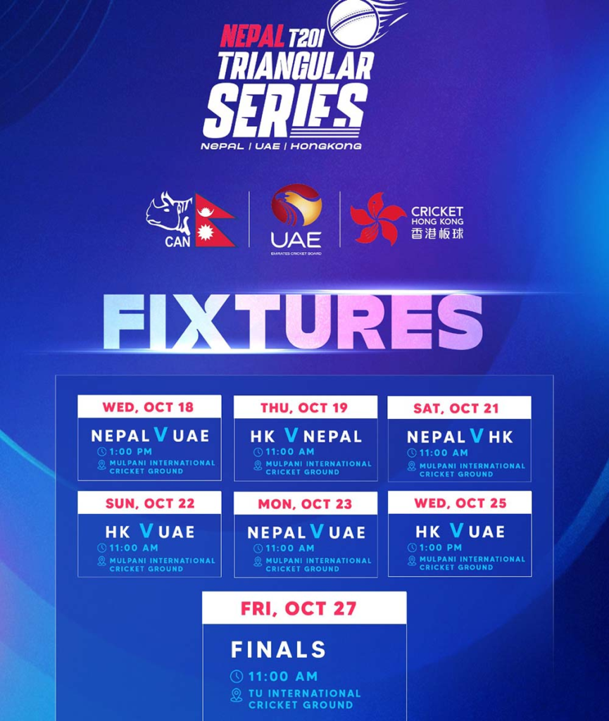नेपालसहित युएई र हङकङ खेल्ने यस त्रिकोणात्मक सिरिजको नेपाल क्रिकेट संघ (क्यान) ले बुधबार खेल तालिका सार्बजनिक गरको हो ।