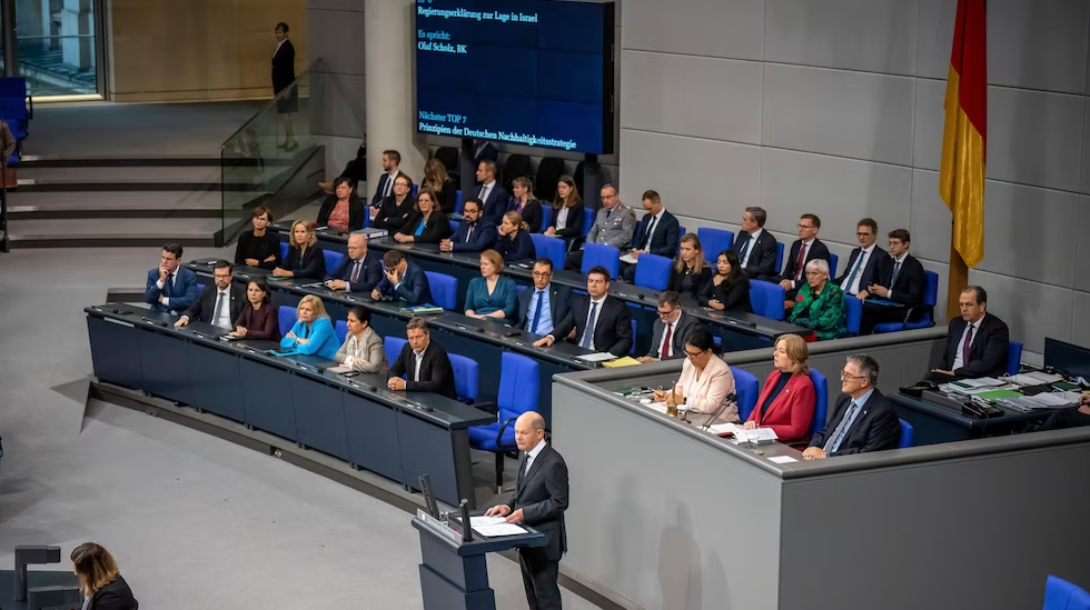 जर्मन संसद्लाई सम्बोधन गर्दै कुनै पनि सहयोगका लागि सूचित गर्न आफूले इजराइली प्रधानमन्त्री बेन्यामिन नेतान्याहुलाई आग्रह गरेको बताए। ‘अहिले जर्मनीका लागि एउटा मात्र ठाउँ छ र त्यो ठाउँ भनेको इजराइलको पक्षमा हो’, उनले सांसदहरूलाई भने, ‘हाम्रो आफ्नै इतिहास र दोस्रो विश्वयुद्धमा यहुदीविरुद्ध भएको नरसंहारबाट उत्पन्न भएको हाम्रो जिम्मेबारीले इजरायलको सुरक्षाका लागि उभिन हाम्रो दृढतालाई अविचलित बनाउँछ ।’