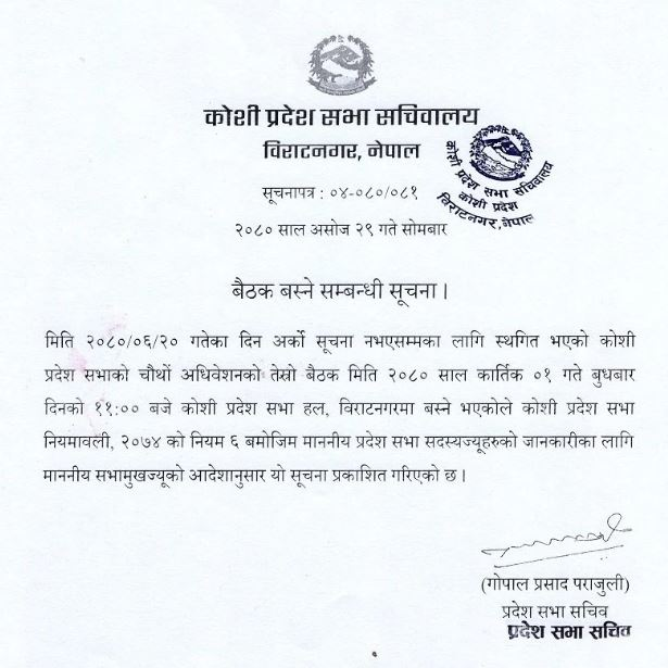 प्रदेश सभा सचिवालयले सोमबार एक सूचना जारी गर्दै कात्तिक १ गते बुधबार दिनको ११ बजेका लागि बैठक बस्ने सूचना जारी गरेको हो ।