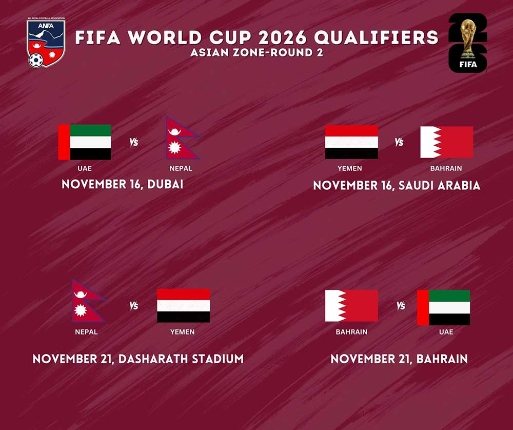 विश्वकप फुटबल छनौटको दोस्रो चरणमा नेपालले पहिलो खेल युएईविरुद्ध नोभेम्बर १६ मा अवे खेल खेल्ने छ भने जुन ६ मा घरेलु मैदानमा खेल्ने छ । त्यस्तै बहराइनविरुद्ध २१ मार्चमा घरेलु मैदानमा खेल्ने छ भने २६ मार्चमा अवे खेल खेल्ने भएको छ । त्यसै गरि यमनसँग २१ नोभेम्बरमा घरेलु मैदानमा खेल्ने छ भने ११ जुनमा अवे खेल खेल्ने भएको छ ।