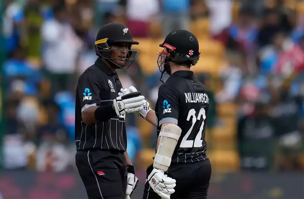 न्यूजील्याण्डका लागि रचिन रविन्द्रले १०८ रनको शतकीय पारी खेलेका थिए । रविन्द्रको यस विश्वकपमा यो तेस्रो शतक हो । साथै एकदिवसीय क्रिकेटमा पनि २० खेलमा उनको यो तेस्रो शतक हो । रविन्द्रले यस विश्वकपमा इङल्याण्डविरुद्ध १२३ रन बनाएका थिए भने अस्ट्रेलियाविरुद्ध ११६ रन बनाएका थिए ।