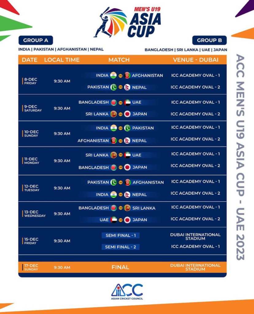 दुबईमा हुने यू-१९ एशिया कप मङ्सिर २२ (डिसेम्बर ८) देखि पुस १ (डिसेम्बर १७) सम्म हुने एसीसीले जनाएको छ ।