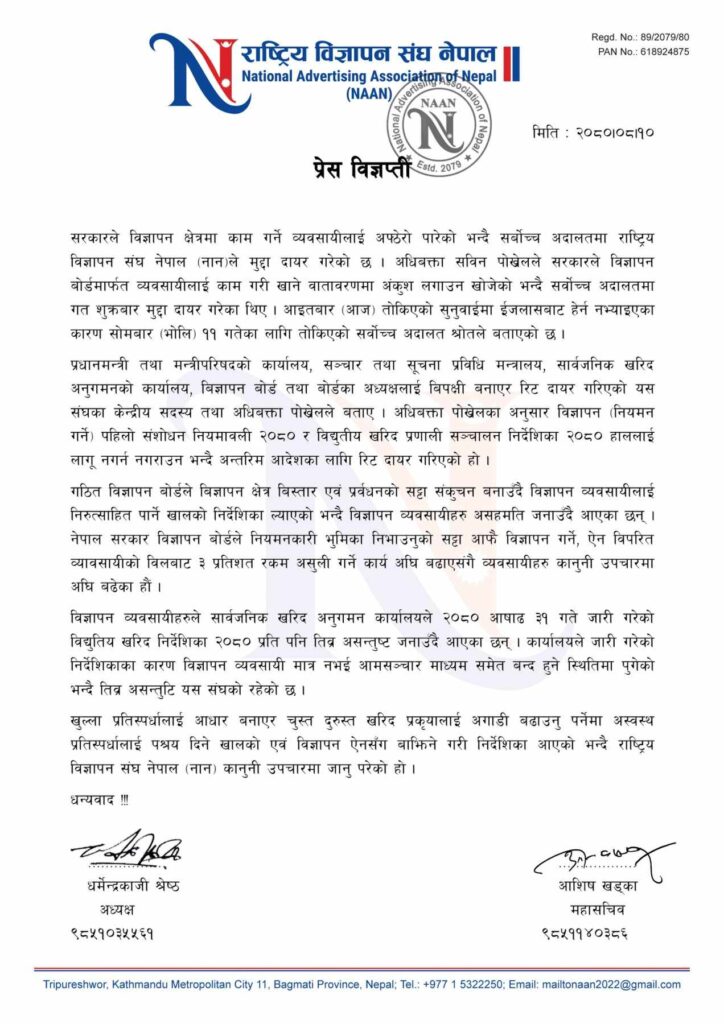 खुल्ला प्रतिस्पर्धालाई आधार बनाएर चुस्त दुरुस्त खरिद प्रकृयालाई अगाडी बढाउनु पर्नेमा अस्वस्थ प्रतिस्पर्धालाई पश्रय दिने खालको एवं विज्ञापन ऐनसँग बाझिने गरी निर्देशिका आएको भन्दै कानुनी उपचारमा जानु परेको राष्ट्रिय विज्ञापन संघ नेपाल (नान) उल्लेख गरेको छ ।