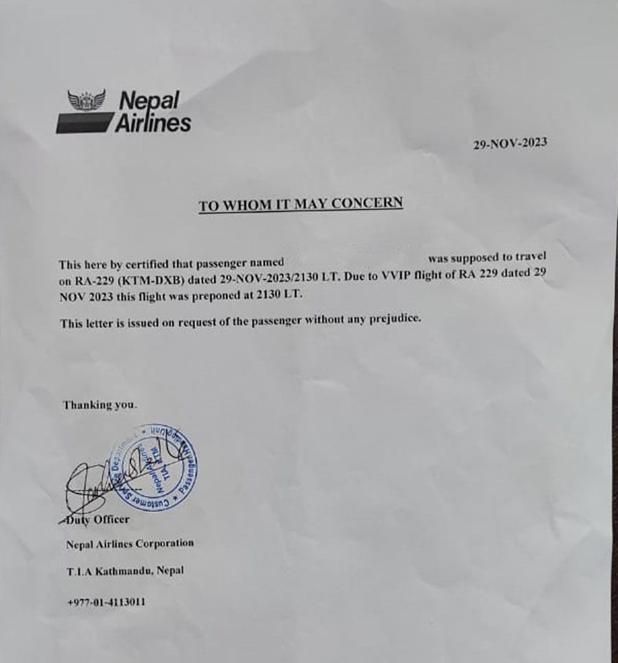 यात्रुहरु छुट्नुको कारण ‘भीभीआईपी फ्लाइट’ रहेको नेपाल एअरलाइन्सले जनाएको छ ।