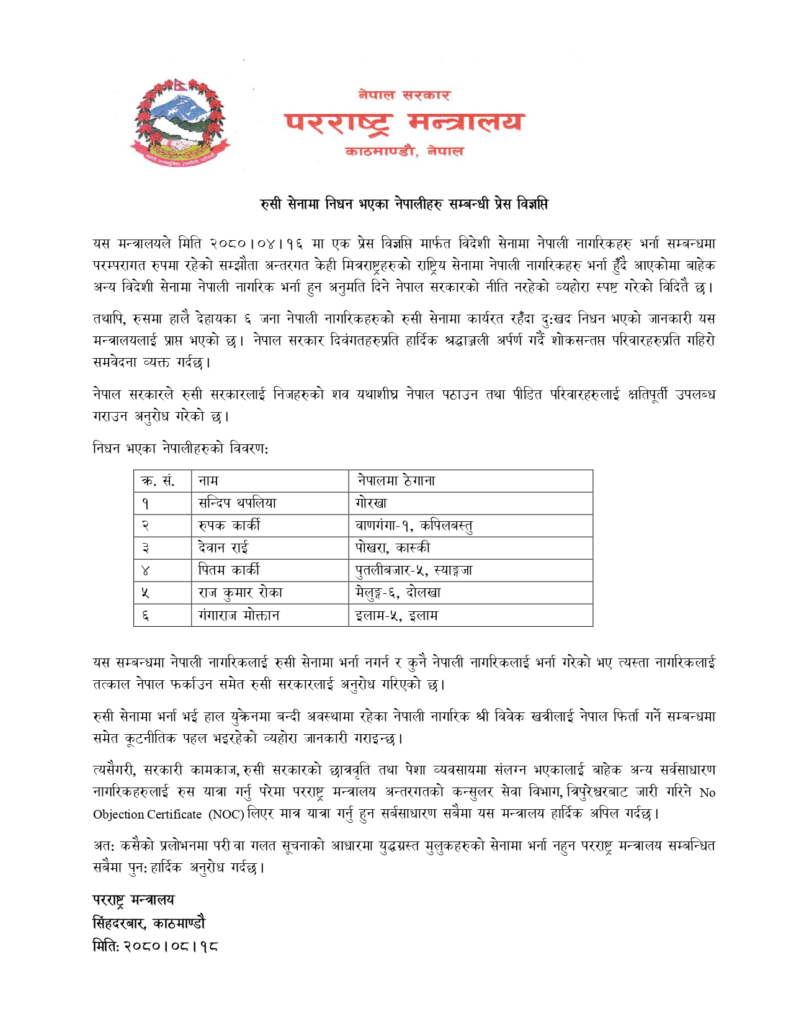 काठमाडौं । परराष्ट्र मन्त्रालयले रुसी सेनामा कार्यरत ६ जना नेपालीको मृत्यु भएको पुष्टि गरेको छ। सोमबार विज्ञप्ति जारी गर्दै मन्त्रालयले ६जनाको नामसमेत सार्वजनिक गरेको छ।