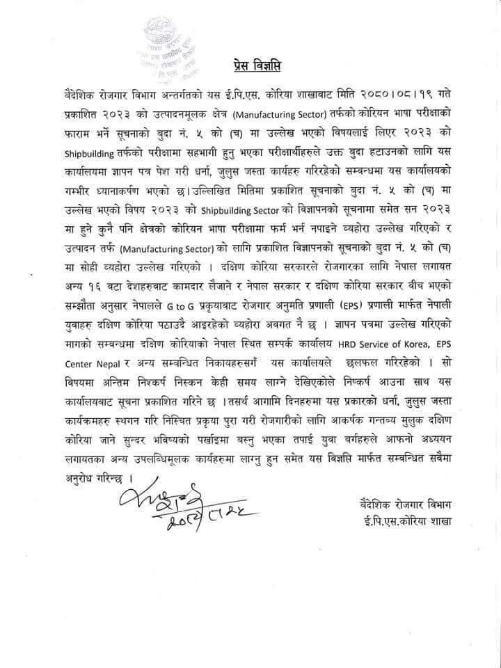 उल्लिखित मितिमा प्रकाशित सूचनाको बुदा नं. ५ को (च) मा उल्लेख भएको विषय २०२३ को सिप बिल्डिङको विज्ञापनको सूचनामा समेत सन २०२३ मा हुने कुनै पनि क्षेत्रको कोरियन भाषा परीक्षामा फर्म भर्न नपाइने व्यहोरा उल्लेख गरिएको र उत्पादन तर्फ को लागि प्रकाशित विज्ञापनको सूचनाको बुदा नं. ५ को (च) मा सोही व्यहोरा उल्लेख गरिएको शाखाले जनाएको छ ।