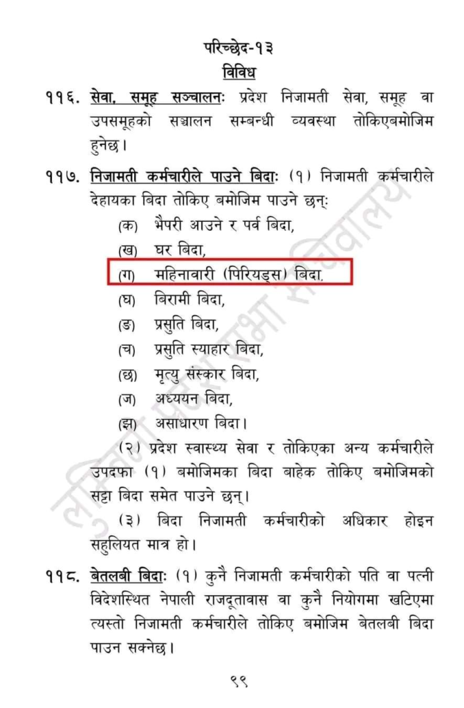 दाङ। लुम्बिनी प्रदेश सरकारले महिला कर्मचारीलाई महिनावारी विदा दिने भएको छ । निजामती सेवाको गठन, सञ्चालन र सेवाका शर्त सम्बन्धमा व्यवस्थापन गर्न वनेको ऐनको परिच्छेद १३ को ११७ मा निजामती कर्मचारीले पाउने विदामा महिनावारी (पिरियड) बिदा भनेर समावेश गरिएको छ ।