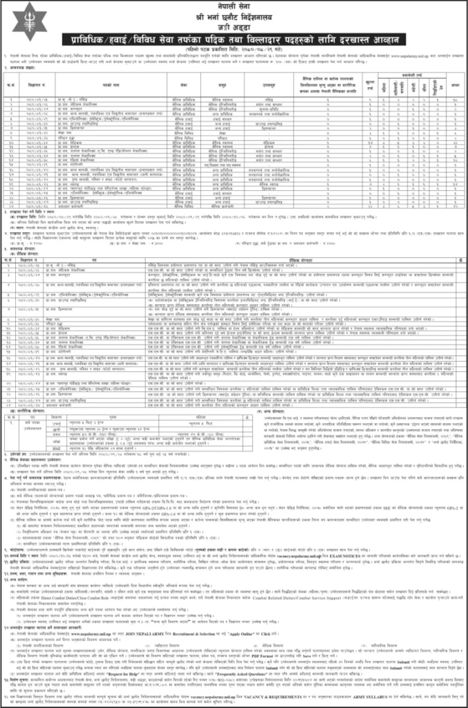 नेपाली सेनाको भर्ना छनौट निर्देशनालय जंगी अड्डाले प्रविधिक र हवाई विविध सेवा तर्फका बिल्लादार पदका लागि दरखास्त माग गरेको हो।