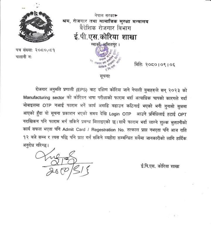 कामठाडौं । रोजगार अनुमति प्रणाली इपियसमार्फत दक्षिण कोरिया जाने नेपाली युवाहरुलाई सन् २०२३ को उत्पादनमुलक क्षेत्रमा आवेदन भर्न समस्या परेको छ । विहीबारदेखी उत्पादनमूलक क्षेत्रको परिक्षामा सामेल हुने विद्यार्थीहरुले अनलाइन आवेदन दिन समस्या आएको गुनासो गरिरहेका छन् ।