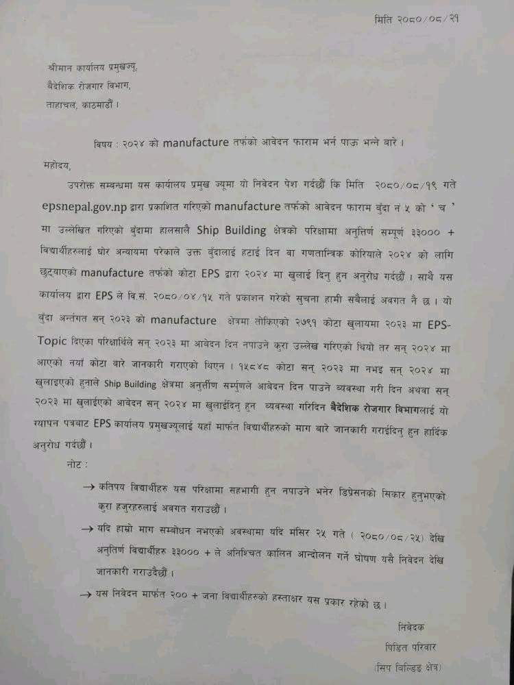 ईपीएस शाखाले मंसिर १९ गते उत्पादनमूलक क्षेत्रका लागि कोरियन भाषा परीक्षाको आवेदन फाराम भर्न सूचना प्रकाशन गरेको सूचनाको बुँदा नम्बर ५ (च) मा सन् २०२३ भित्र अन्य क्षेत्र तर्फ कोरियन भाषाको परीक्षाको लागि आवेदन दिएका आवेदकहरुले उत्पादनमूलक क्षेत्रमा फाराम भर्न नपाउने सुचना जारी भएपछि सिप विल्डिङमा अनुर्तिण भएका सबैले उत्पादनमुलक क्षेत्रको परिक्षामा सामेल हुन पाउनुपर्ने भन्दै सुरजपाठसहितको टिममा हजारौँ विद्यार्थीहरुले इपियस कार्यालय ग्वार्कोदेखि पदर्शन गर्दै उच्च अदालत पाटनमा गएर ३३ हजार भन्दामाथि सिपविल्डिङमा अनुर्तिर्ण सम्पूर्ण विद्यार्थीहरुले २०२३मा खुलेको उत्पादनमुलक क्षेत्रमा आवेदन दिनुपर्ने भन्दै उच्च अदालतमा निवेदन दिएका थिए ।