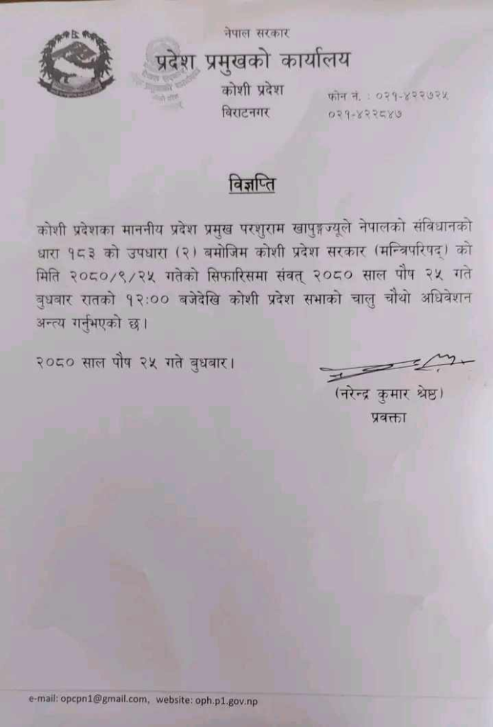 कोशीका प्रदेश प्रमुख परशुराम खापुङले नेपालको संविधानको धारा १८३ को उपधारा ९२० बमोजिम कोशी प्रदेश सरकार (मन्त्रिपरिषद्) को बैठकले बुधबार गरेको सिफारिसमा अधिवेशन अन्त्य गर्ने भएको हो।