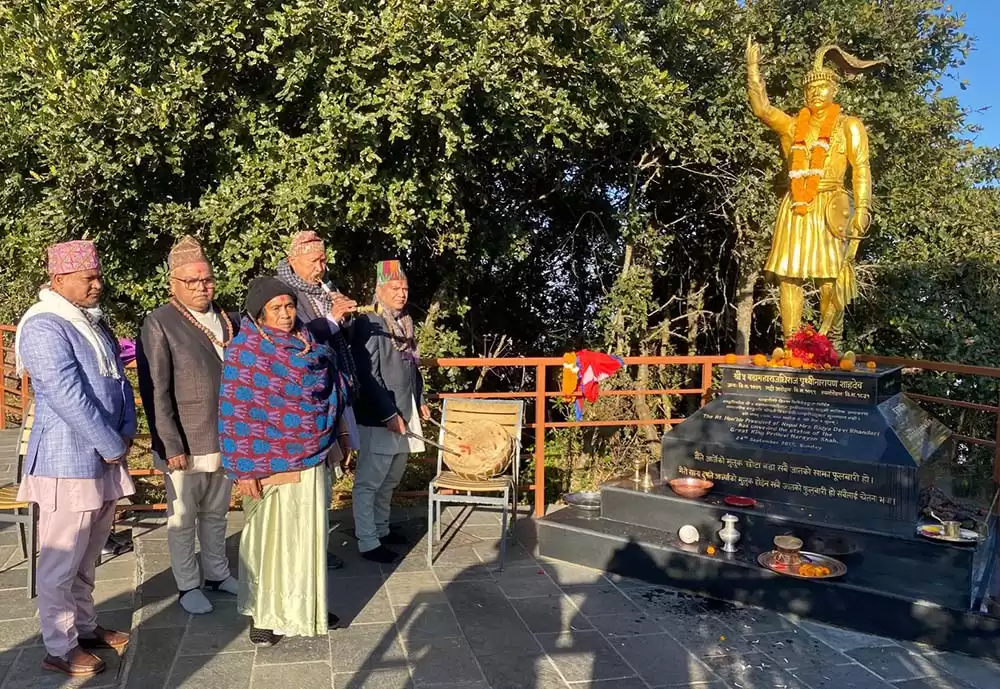 आधुनिक नेपालको एकीकरण अभियानका नेतृत्वकर्ता शाहले नेपालको एकीकरण अभियानमा पु¥याएको योगदानको स्मरण गर्दै शाहको तत्कालीन राज्य गोरखा, सिंहदरबारको मूलढोका तथा देशका विभिन्न स्थानमा राखिएका शाहका सालिकमा माल्यार्पण गरी उहाँको योगदानको स्मरण गरिएको छ तर आज काठमाडौँको चन्द्रागिरि डाँडामा भने अलग्गै र नयाँ तरिकाबाट उहाँको स्मरण गरिएको छ । चन्द्रागिरि डाँडा पृथ्वीनारायण शाहको नेपाल एकीकरणको इतिहाससँग जोडिएको ऐतिहासिकस्थल भएकाले यहाँ पृथ्वीनारायण शाहको पूर्णकदको सालिक निर्माण गरिएको छ ।