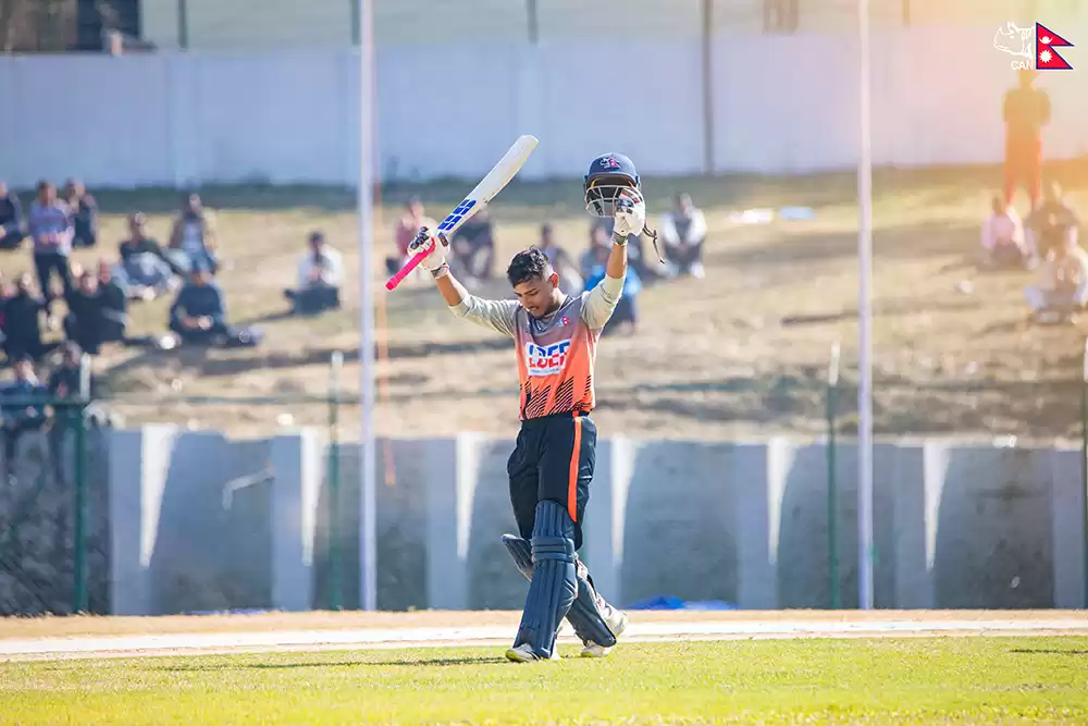 केवल ४१ रनमा ५ विकेट गुमाएको एपीएफलाई सन्दीपले सम्हालेका थिए । सन्दीपले ११७ बलमा ११२ रन बनाएका थिए ।