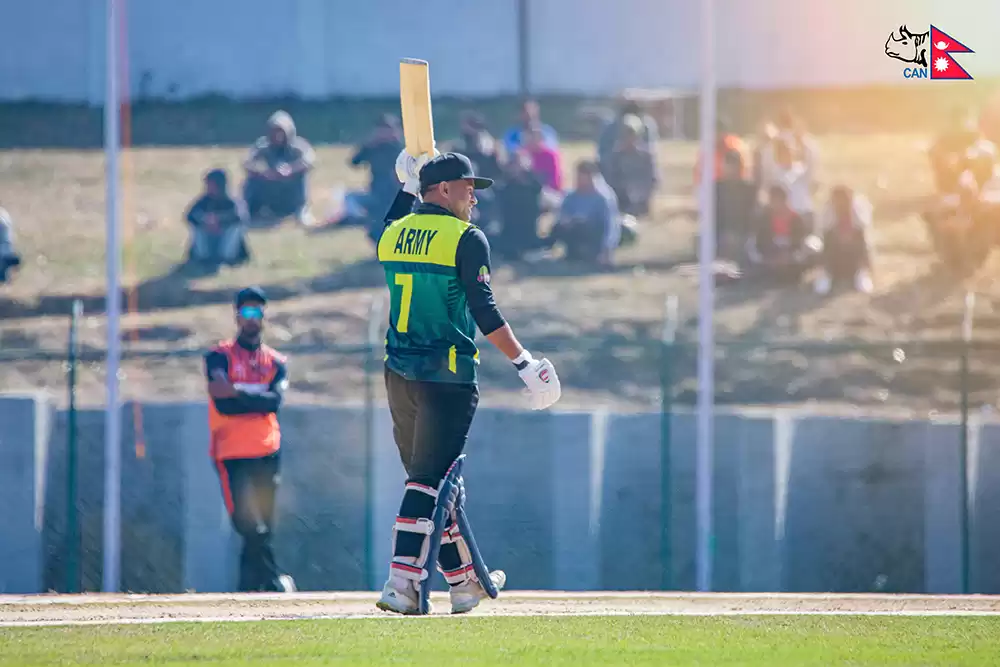आर्मीका लागि कप्तान विनोद भण्डारीले शानदार ब्याटिंग गर्दै ११३ रन बनाएका थिए । भण्डारीदले ९३ बलमा ९ चौका र ६ छक्का प्रहार गर्दै ११३ रन बनाएर आउट भएका थिए ।