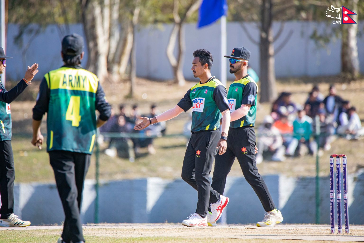 त्यस्तै विवेक यादव र कुशल मल्लले समान ३७ रन जोड्दा सन्तोष कार्की ४२, इमरान शेखले २६ र भीम सार्कीले १८ रन जोडे । वसिर अहमदले १६ रन थप्दा आर्मीले अतिरिक्तमा पनि १६ रननै पाएको थियो ।