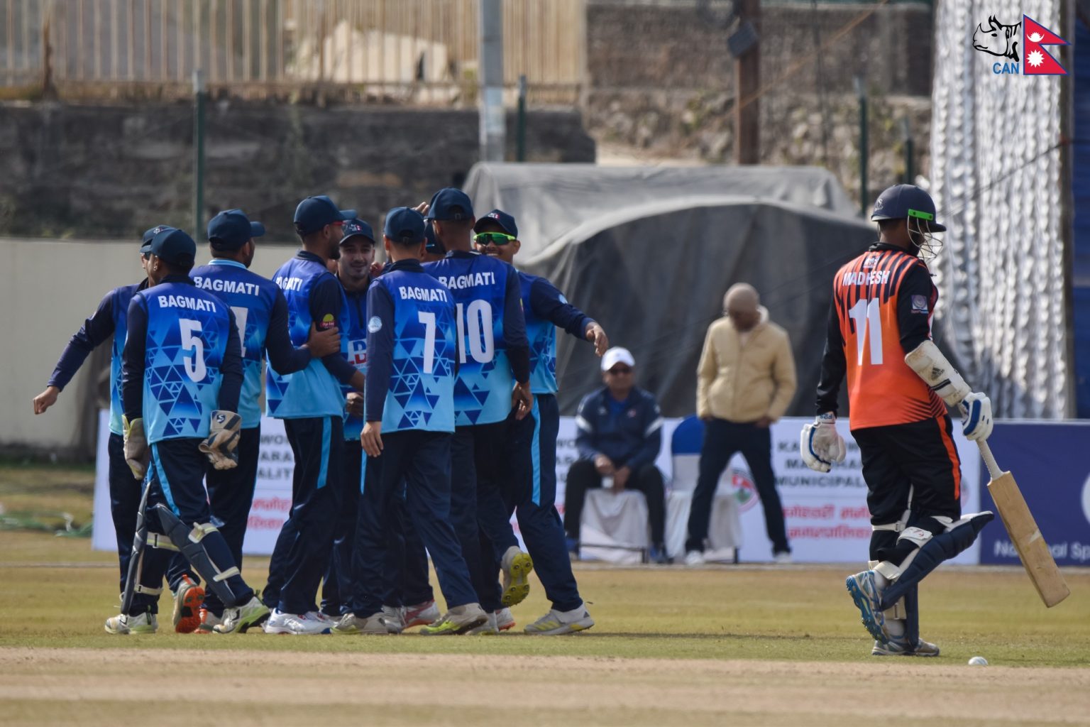 त्यस्तै रविन जोशीले २१ रन थपेको खेलमा इशान पाण्डेले १५, विपीन आचार्यले १३, रित गौतमले १२ र रिजन ढकालले ११ रन थपे । बागमतीले ३८ रन अतिरिक्तरुपमा पाएको छ ।