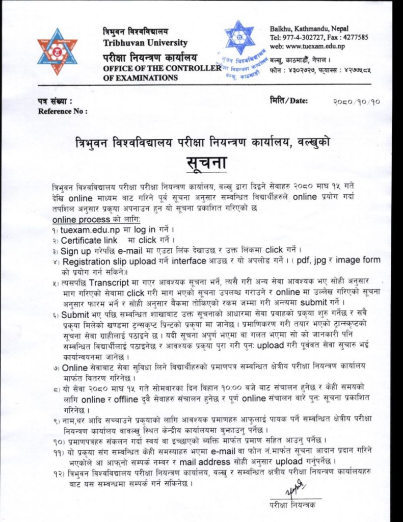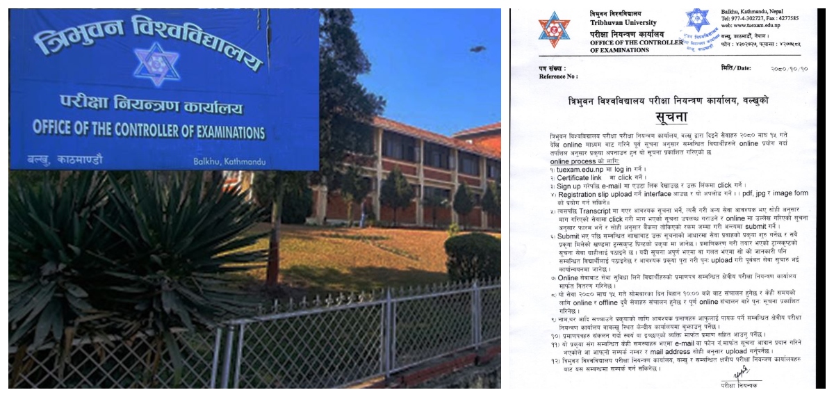 काठमाडौं । त्रिभुवन विश्वविद्यालयका विद्यार्थीहरूले अब ट्रान्सक्रिप्ट र मार्कसिट लिनका लागि परीक्षा नियन्त्रण कार्यालय धाउनु नपर्ने भएको छ । परीक्षा नियन्त्रण कार्यालय बल्खुले कार्यालयका सेवालाई अनलाइन प्रणालीमा लगेको हो । कार्यालयले यही माघ १५ गतेदेखि अनलाइनको माध्यमबाटै सेवा लिन सकिने गरी व्यवस्था गरिएको जनाएको छ ।