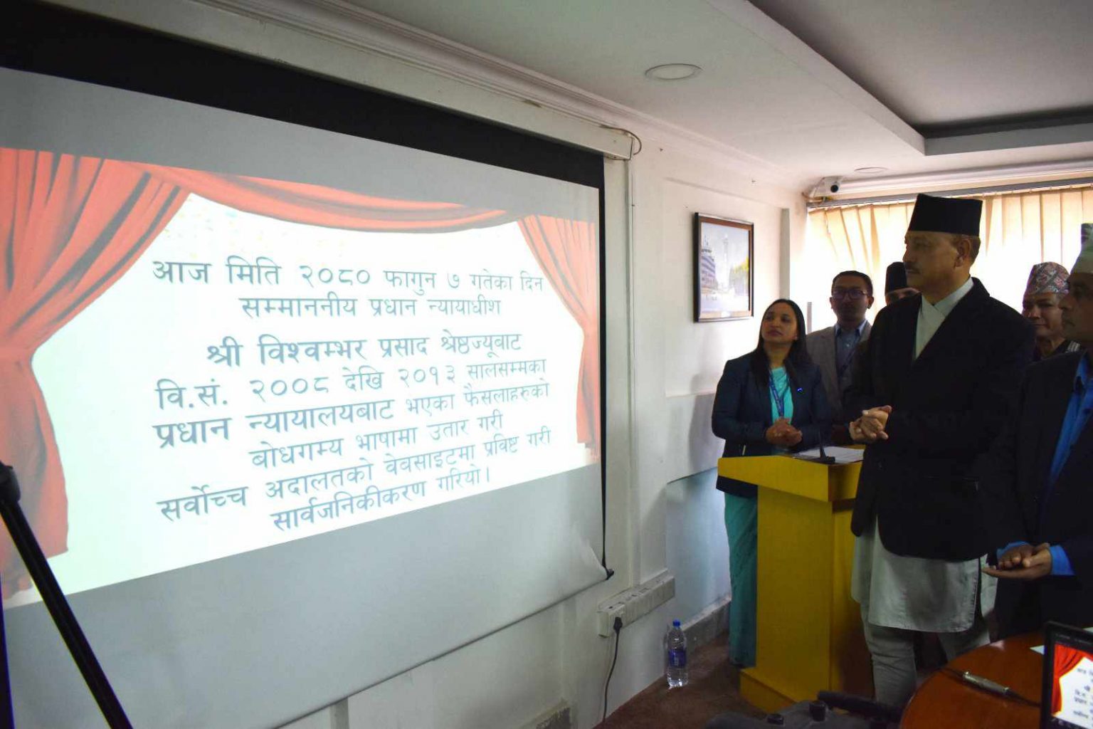 प्रधानन्यायाधीश विश्वम्भरप्रसाद श्रेष्ठले प्रधान न्यायालयको फैसला उतार गरी प्रकाशन गर्नु आफैँमा महत्वपूर्ण भएको बताए । उनले न्यायाधीश, कानुन र न्यायको क्षेत्रमा कार्यरत अधिकृत तथा कर्मचारी, कानुन व्यवसायी, अनुसन्धानकर्ता, कानुनका विद्यार्थीलगायत सरोकारवालालाई अत्यन्तै उपयोगी स्रोत सामग्री हुने विश्वास व्यक्त गरे । प्रधानन्यायाधीश श्रेष्ठले न्यायालयका कतिपय फैसला न्यायिक इतिहासमा युगान्तकारी फैसला रहेका र फैसलालाई बोधगम्य भाषामा उतार गरी सर्वोच्च अदालतको वेबसाइटमा प्रविष्ट गरी सबैका लागि पहुँचयोग्य बनाउनु आफैँमा ऐतिहासिक कार्य भएको बताए ।