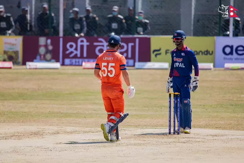 नेदरल्याण्डसका लागि माइकल लेभिटले ५४ रन बनाएका थिए । लेभिटले यसै खेलमा आफ्नो टी-२० अन्तराष्ट्रिय डेभ्यु गर्दै अर्धशतकीय पारी खेलेका हुन् । त्यस्तै सिब्राण्ड एंगेलब्रेचटले अविजित ४९ रन बनाए भने कप्तान स्कट एडवार्ड्सले ३३ रन बनाए भने तेजा निदामनुरुले ३१ रन बनाएका थिए ।