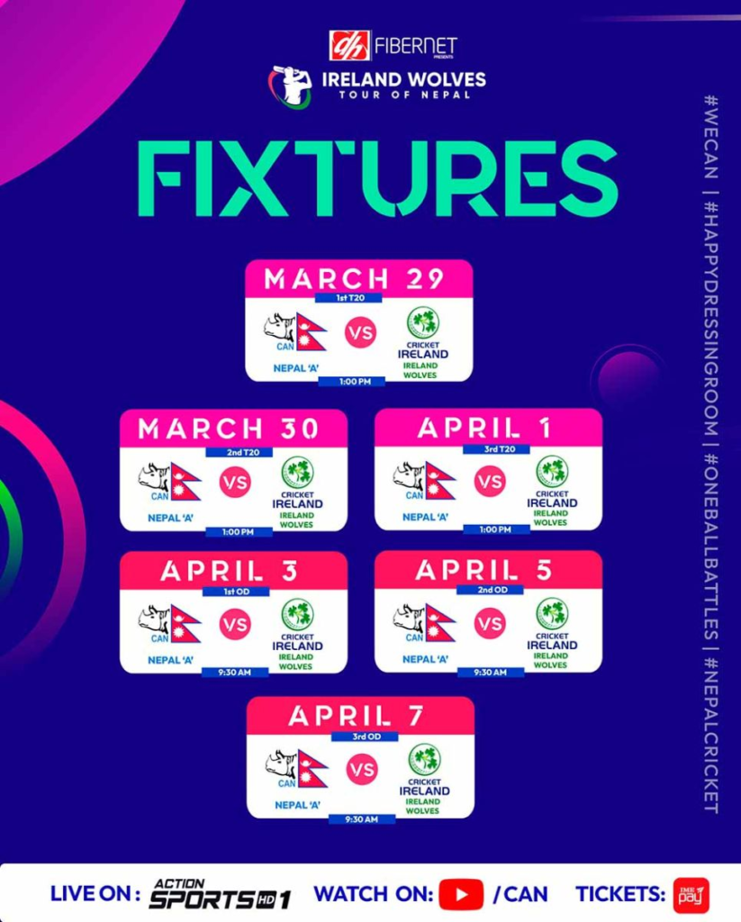 काठमाडौँ । नेपाल क्रिकेट संघ (क्यान) ले नेपाल ए र आयरल्याण्ड वोल्भ्सबीचको टी-२० सिरिजको नयाँ तालिका सार्बजनिक गरेको छ ।