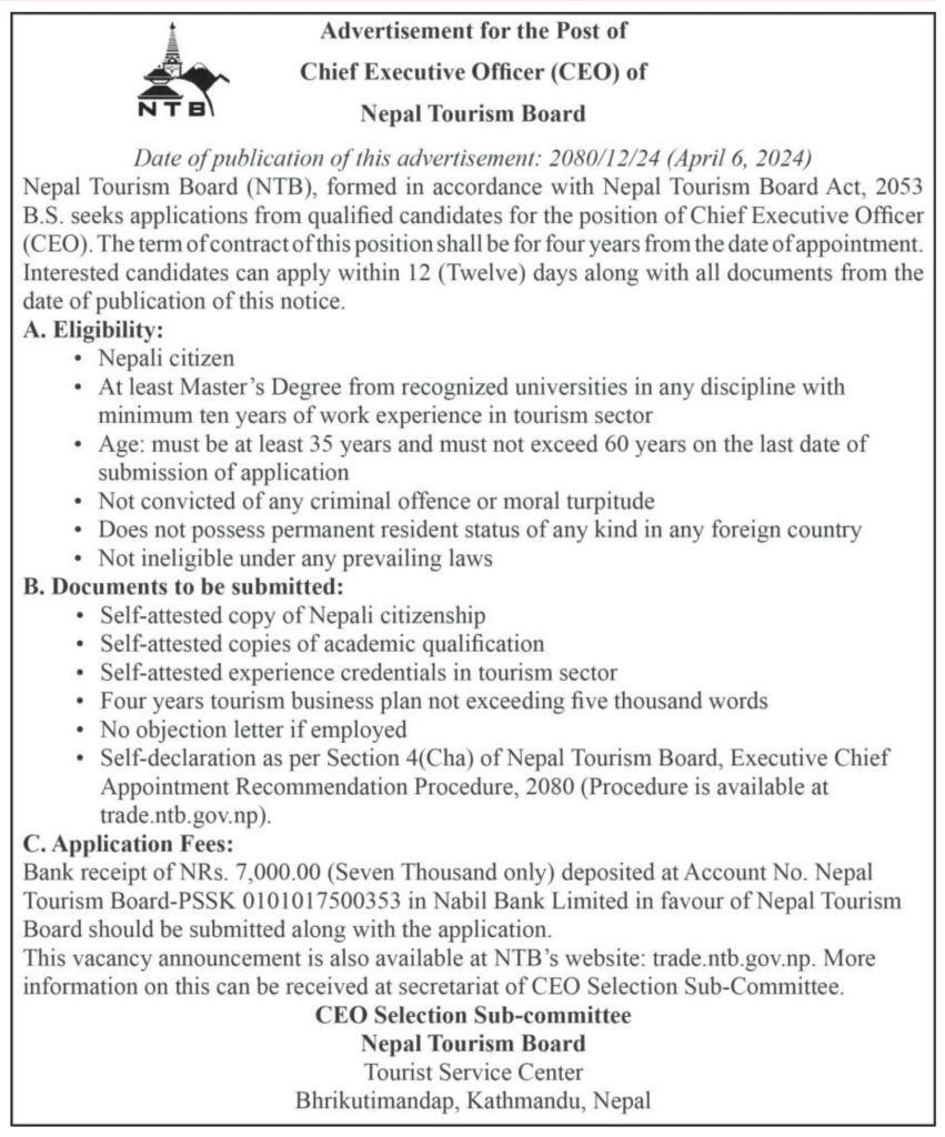 काठमाडौं ।नेपाल पर्यटन बोर्डले प्रमुख कार्यकारी अधिकृत (सीईओ) पदका लागि दरखास्त आह्वान गरेको छ। बोर्डले शनिबार सार्वजनिक सूचना प्रकाशन गरी सीईओ माग गरेको हो।