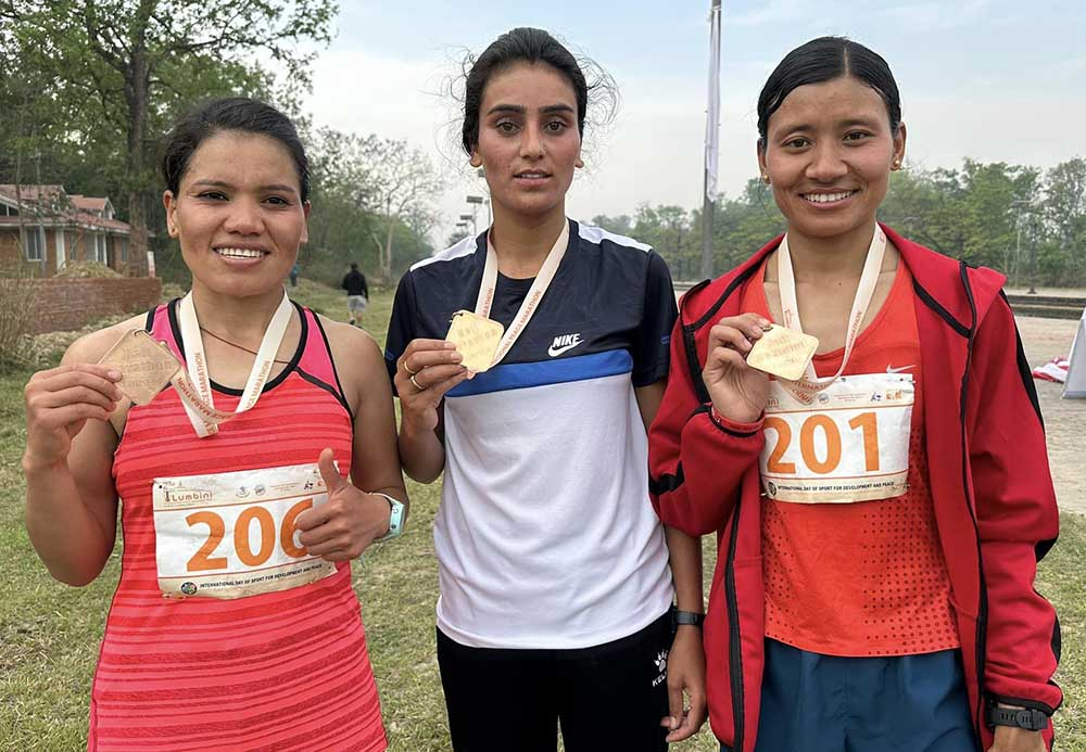 त्यस्तै महिलातर्फ हाफ म्याराथनमा नेपाली सेनाकी पुर्णराज्यलश्रमी न्यौपानेले १ घण्टा १९ मिनेट २१ सेकेन्डमा दुरी पार गर्दै दोस्रो र एपीएफकी पुष्पा भण्डारीले १ घण्टा २५ मिनेट १४ सेकेन्डमा दुरी पार गरेर तेस्रो भइन् । दोस्रो भएकी न्यौपानेलाई १ लाख ६० हजार तथा तेस्रो भएकी भण्डारीले १ लाख २० हजार नगद पुरस्कारसहित प्रमाणपत्र प्राप्त गरेका छन् ।