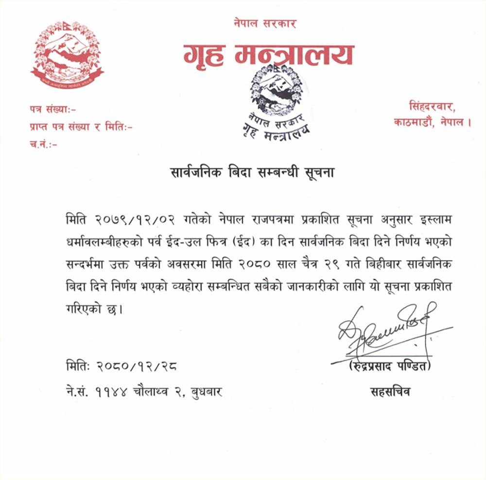 गृहमन्त्रालयले बुधवार एक सूचना जारी गर्दै विहिबार सार्बजनिक बिदा दिने निर्णय गरेको जानकारी दिएको हो ।