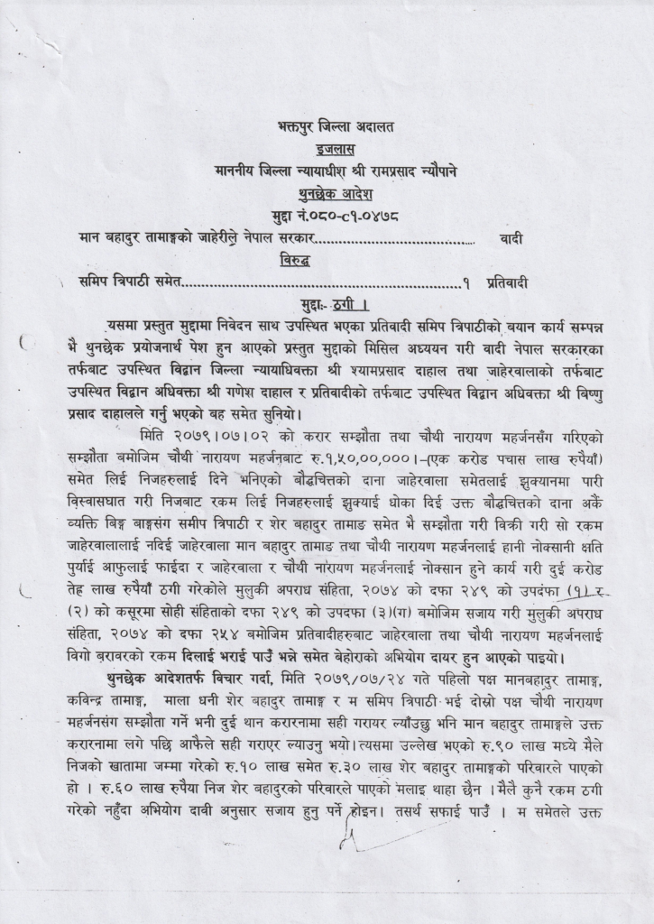 आफूहरू ठगीमा परेको भन्दै सिजनले दर्ता गरेको मुद्दाको फैसला हुन नपाइरहेका बेला अज्ञात व्यक्तिहरूले मालाको रुख नै काटिदिएसँगै पीडित मानबहादुर आरोपितका नाउँमा हाल प्रहरीको नियन्त्रणमा छन् । उक्त ठगी प्रकरणमा बुद्धचित्त मालाका बोट धनी शेरबहादुर तामाङ केही समय थुनामा परेको र समिप त्रिपाठी लामो समयसम्म फरार भई अदालतमा ७५/७५ लाख धरौटी तिरेर छुटेका व्यक्ति हुन् । ठगी प्रकरणकै मुद्दामा समिक त्रिपाठी र शेरबहादुरको सम्पूर्ण बैङ्क खाता र चल अचल सम्पत्ति हालसम्म पनि अदालतमा रोक्का भइरहेको तथ्य हामीलाई प्राप्त भएको छ ।