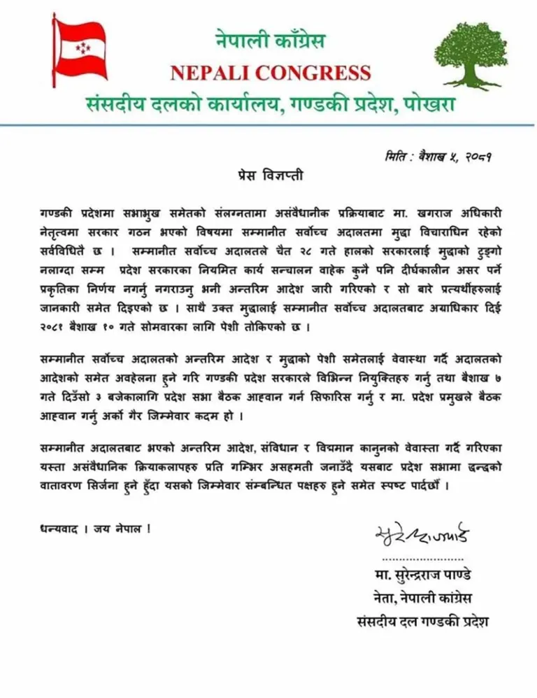 पोखरा।नेपाली कांग्रेसले गण्डकी प्रदेश अधिवेशन आह्वान गर्नु गैर संवैधानिक भएको बताएको छ ।