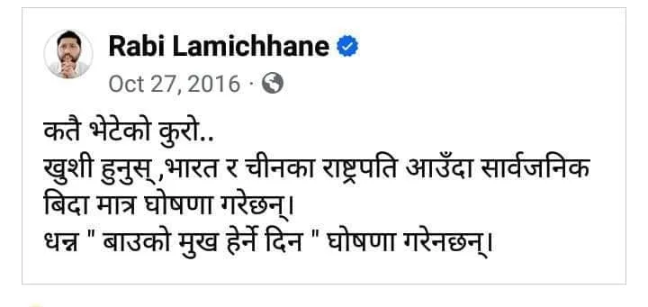 आज कतारका अमिर आउने दिनमा गृह मन्त्रालयले दिएको बिदालाई लिएर सामाजिक सञ्जालमा उनको पुरानो अभिव्यक्ति उत्खनन् भएपछि लामिछानेले यस्तो प्रतिक्रिया दिएका हुन् ।