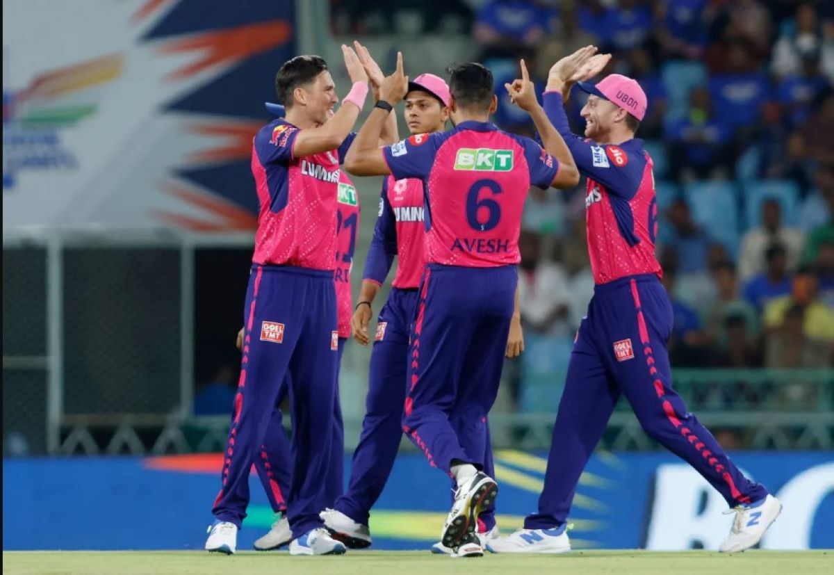 आयुष बडोनी १८ रनमा अविजित रहे भने कृणाल पाण्ड्या १५ रनमा अविजित रहे । राजस्थान रोयल्सका लागि सन्दीप शर्माले सर्वाधिक २ विकेट लिए । लक्ष्य पछ्याउने क्रममा राजस्थान रोयल्सलाई यशस्वी जैसवाल र जोस बटलरले राम्रो सुरुवात गरेका थिए । दुवैले पावरप्लेमा नै स्कोरलाई ५० भन्दा माथि पुर्याएका थिए । तर, छैठौं ओभरमा जोस बटलरको विकेट गुम्यो । उनी १८ बलमा ३४ रन बनाएर आउट भए । जैसवाल पनि ठूलो इनिङ खेल्न नसकेर १८ बलमा २४ रन बनाएर सातौं ओभरमा ६० रनको स्कोर हुँदा प्याभिलियन फर्किए । इम्प्याक्ट खेलाडी रायन परागले खास केही गर्न सकेनन् । उनी ११ बलमा १४ रन बनाएर अनुभवी अमित मिश्राको शिकार बने ।