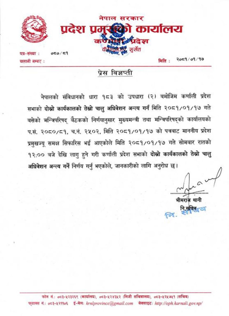 सुर्खेत । कर्णाली प्रदेशसभाको दोस्रो कार्यकालको तेस्रो अधिवेशन अन्त्य गरिएको छ । सोमबार राति १२ बजेदेखि लागू हुने गरी अधिवेशन अन्त्य गरिएको हो ।