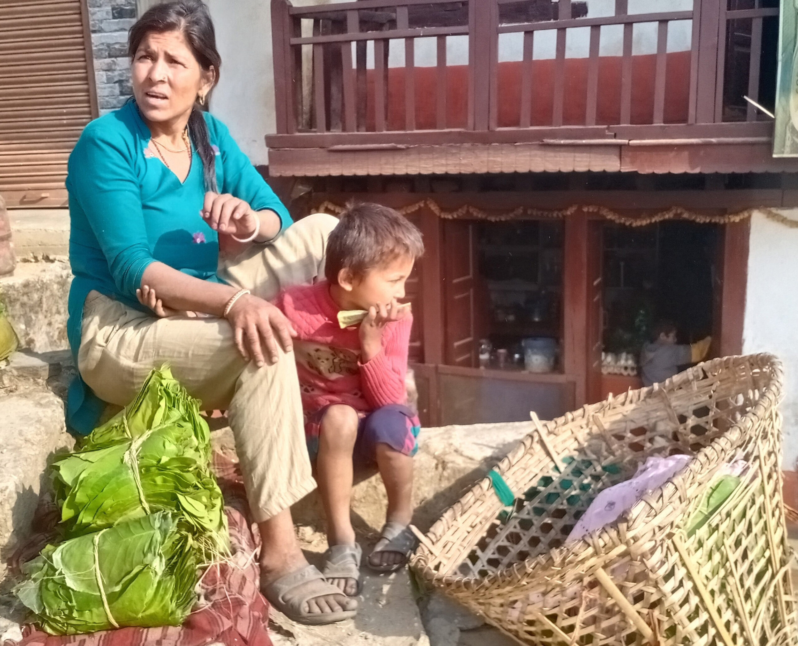कमाउन विदेश गएका श्रीमान् बिरामी छन। कलकलाउँदा उमेरका तीन छोराछोरी छन् । अहिले त सानो बाबु पनि ठीक हुँदैछ”, गहभरी आँसु पार्दै उनले भनिन, “बनीबुतो गरेको पैसाले दैनिक हातमुख जोड्न धौ(धौ छ । सालको पात टिपेर बेच्दै थिएँ त्यो पनि डढेलोले केही महिनालाई नपाइने भयो ।”