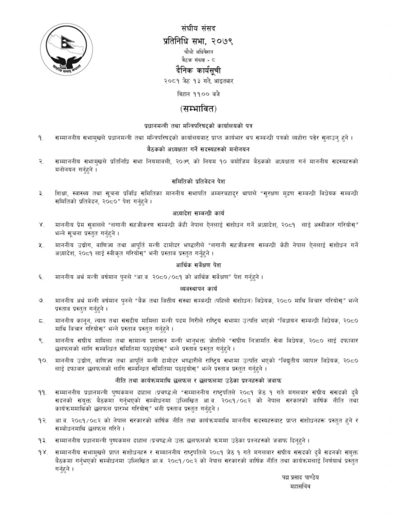 काठमाडौं । प्रतिनिधिसभाको भोलि बस्ने बैठकको सम्भावित कार्यसूची सार्वजनिक गरिएको छ । आइतबार बिहान ११ बजे बस्ने बैठकका लागि महासचिव पद्मप्रसाद पाण्डेले १४ वटा कार्यसूची सार्वजनिक गरेका हुन् ।