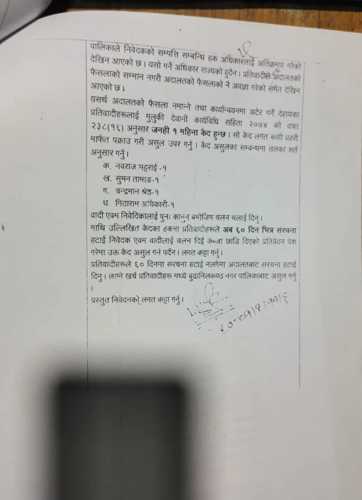 जिल्ला अदालतले २०८० \१८ गते विवादित क्षेत्रमा रहेका संरचना हरू हटाउनको लागि १०० दिनको समयअवधि दिएको थियो । संरचना नहटाउने कार्यले अदालतको फैसला सम्मान नगरेको देखिएको अदालतले जनाएको छ ।