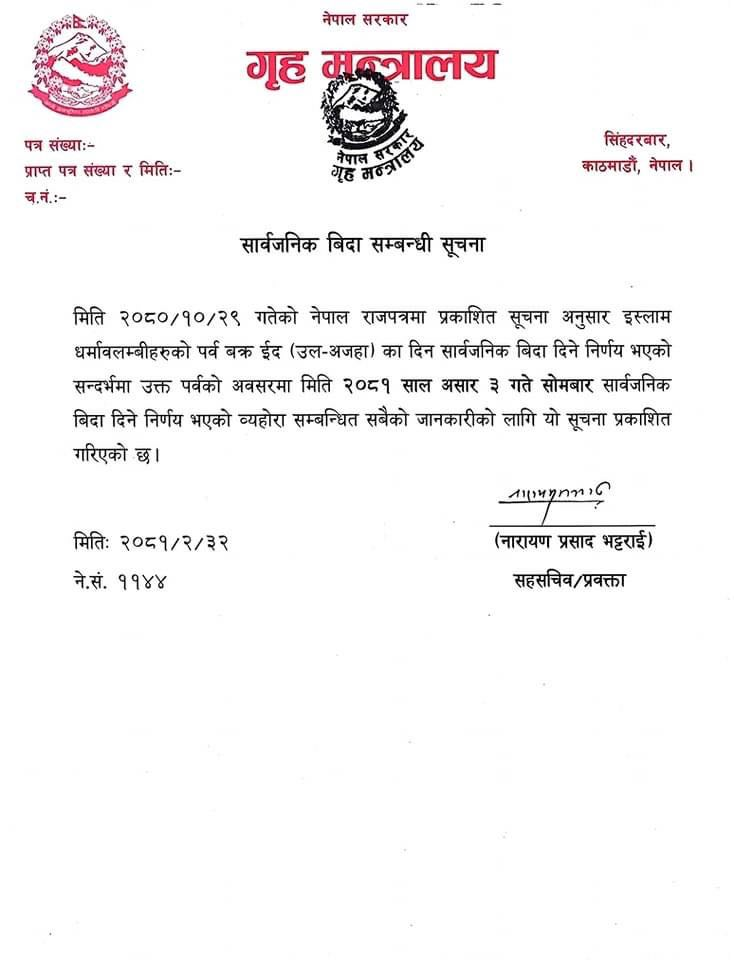 इस्लाम धर्मावलम्बीहरूको पर्व बक्र ईद(उल–अजहा) परेकाले सार्वजनिक बिदा दिइएको हो ।