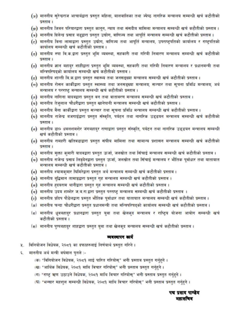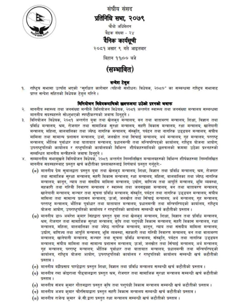 त्यस्तै विनियोजन विधेयक २०८१ का दफाहरूलाई निर्णयार्थ प्रस्तुत गरिने सम्भावित कार्यसूचीमा उल्लेख छ ।