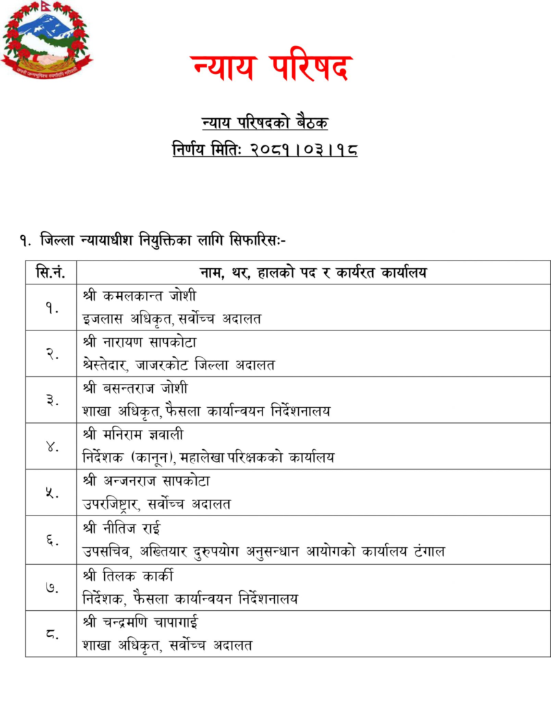 न्याय परिषद्को मंगलबार बसेको बैठकले अदालत, महालेखापरीक्षकको कार्यालय, अख्तियार दुरुपयोग अनुसन्धान आयोग लगायतका कार्यरत न्याय सेवाका उपसचिव सरहका कर्मचारीलाई जिल्ला न्यायाधीश नियुक्तिका लागि सिफारिस गरिएको हो ।