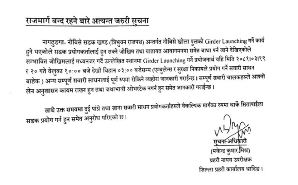 जिल्ला प्रहरी कार्यालय धादिङले बुधबार एक सूचना जारी गर्दै बुधबार र बिहीबार राति १० बजेदेखि बिहान ३ बजेसम्म उक्त क्षेत्रमा सवारी आवागमन पूर्ण रुपमा रोक लगाइने बताएको छ ।
