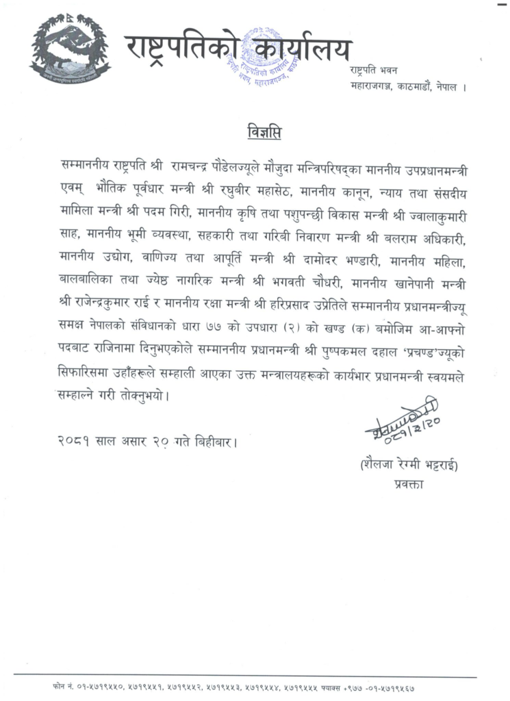 सरकारलाई दिएको समर्थन फिर्तासँगै एमालेबाट सरकारमा सहभागी ८ जना मन्त्रीहरूले संयुक्त रूपमा राजीनामा दिएका थिए । त्यसपछि उक्त मन्त्रालयको जिम्मेवारी प्रचण्ड आफैले सम्हाल्ने राष्ट्रपति कार्यालयले जनाएको छ ।