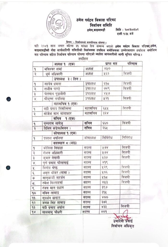 परिषदको महासचिवमा बद्रीप्रसाद तिमल्सिना, सचिवमा पुण्यराम लागेजु र कोषाध्यक्षमा प्रकाश थपलिया निर्वाचित भए । सदस्यमा कोपिला सिंखडा, रोशन अधिकारी, कुमार नेपाली, विनोद श्रेष्ठ, अमृत थोकर लामा, सानुकाजी महर्जन, रमेश विश्वकर्मा र बद्रीप्रसाद अर्याल निर्वाचित भएका छन् । कुल १५ सदस्यीय कार्यसमितिका लागि हुने मतदानमा एक हजार एक सय ९३ जनाले मतदाता रहेकोमा एक हजार ३१ मतदाताले मतदान गरेका थिए ।