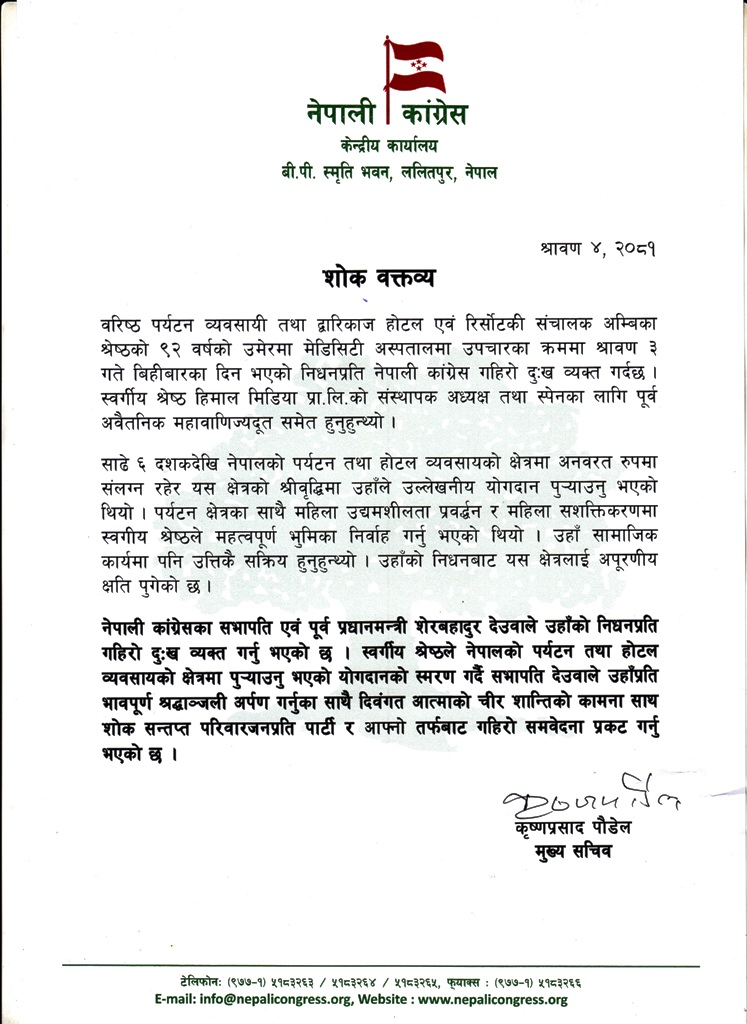 काठमाडौँ। नेपाली कांग्रेसका सभापति एवं पूर्वप्रधानमन्त्री शेरबहादुर देउवाले वरिष्ठ पर्यटन व्यवसायी तथा द्वारिकाज होटल एवं रिसोर्टका सञ्चालक अम्बिका श्रेष्ठको निधनप्रति दुःख व्यक्त गरेका छन् । उनको ९२ वर्षको उमेरमा उपचारका क्रममा यही साउन ३ गते निधन भएको हो ।