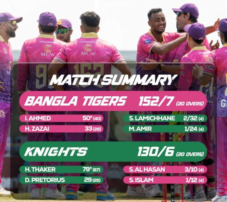 शनिबार साँझ भएको खेलमा बंगला टाइगर्स मिसिसाउगाविरुद्ध पहिले बलिङ गरेको भ्यानकुभर २२ रनले पराजित भएको हो।
