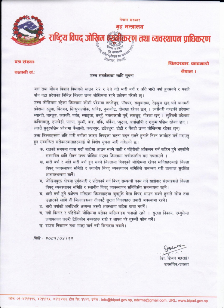 प्राधिकरणले विपद्को जोखिममा रहेका नागरिकलाई जिल्ला विपद् व्यवस्थापन समिति र स्थानीय विपद् व्यवस्थापन समितिले समन्वय गरी तत्काल सुरक्षित आश्रयस्थलमा सार्न, जोखिमयुक्त क्षेत्रमा पूर्वतयारी र प्रतिकार्य गर्न विपद्सम्बन्धी काम गर्ने साझेदार संस्थालाई जिल्ला र स्थानीय विपद् व्यवस्थापन समितिसँग समन्वयमा रहन सूचित गराएको छ ।